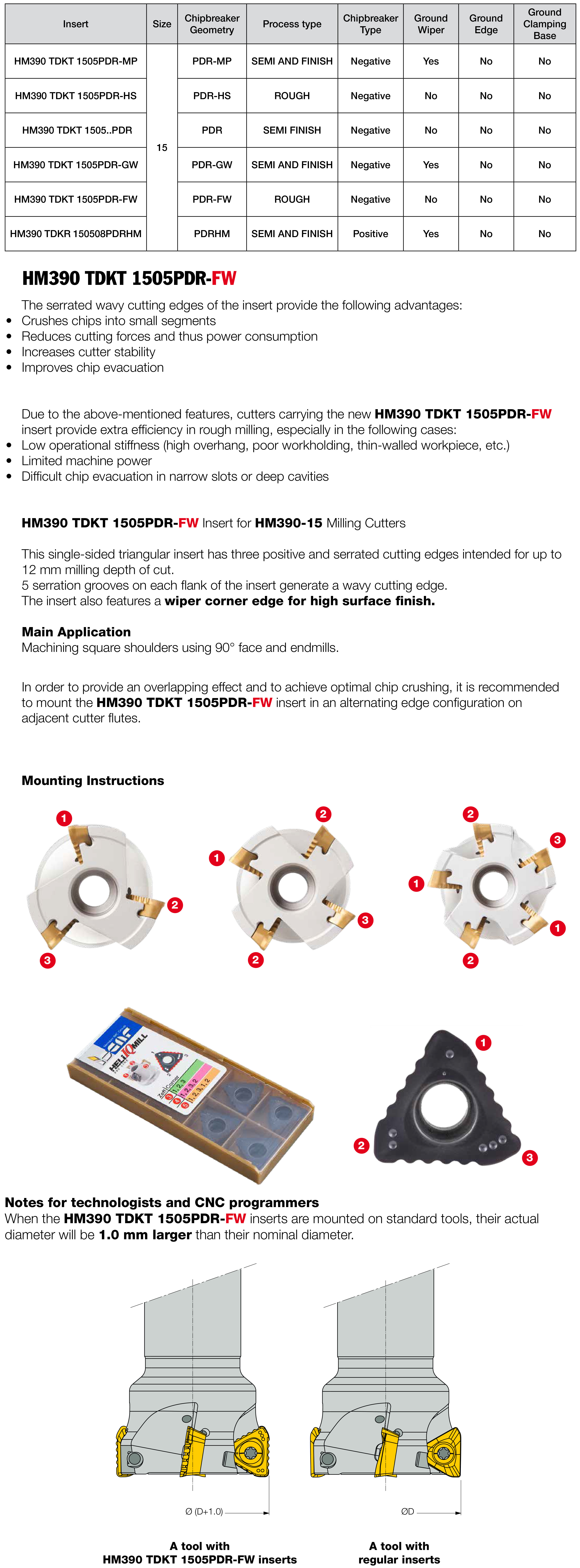 DescFamille | Plaquettes triangulaires avec 3 arêtes de coupe hélicoïdales pour épaulement précis à 90°. Pour les applications générales. | Nom de la gamme | HM390 TDKT/CT 1505 |